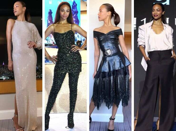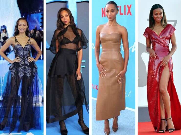 Alla première mondiale di Avatar: La via dell’acqua, Zoe Saldana ha scelto un abito total black in chiffon con corpetto ricamato in argento di Alexander McQueen. A Londra, sempre per Avatar, resta con un total black in chiffon che gioca con le trasparenze, ma porta la firma di Victoria Beckham. All’anteprima di From Scratch – La forza di un amore ha optato per un abito in pelle di Fendi. Invece alla Mostra del Cinema di Venezia 2021 ha osato con un total red sparkling di Dolce&Gabbana.