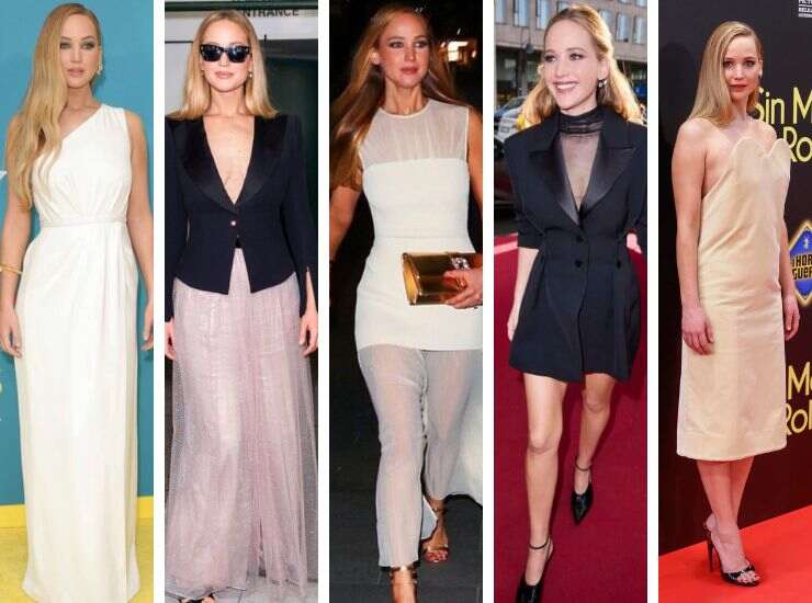 Il press tour di Fidanzata in affitto è lungo e ancora in corso, motivo per cui Jennifer Lawrence ha avuto la possibilità di sfoggiare tutto il suo fascino con il supporto della sua stylist Jamie Mizrahi, che cura anche look di altre celebrità come Adele e Riley Keough. Per la première newyorkese della sua ultima commedia al cinema, ha sfoggiato un abito total white con dettaglio monospalla di Dior Pre-Fall 2023. In aggiunta, ha optato per accessori in oro, dai sandali Manolo Blahnik ai gioielli Tabayer. Ospite della trasmissione Watch Wath Happens Live, ha proposto un completo di Armani Privé con blazer total black e top nude tempestato di strass in pendant con la gonna avorio e in chiffon. Si tratta di un look vintage, della collezione Fall 2019.