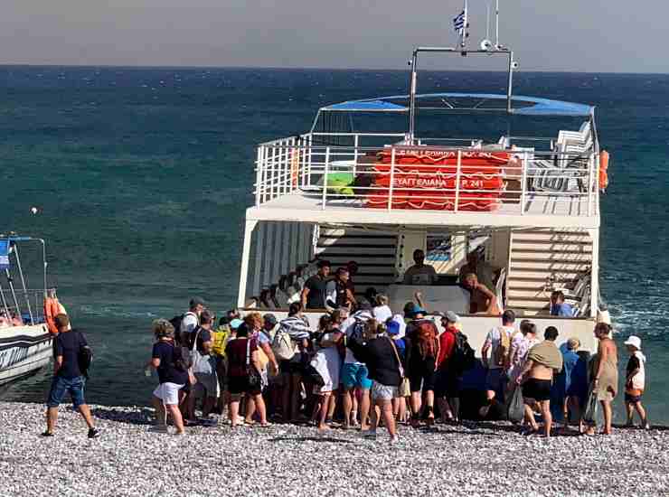 Persone evacuate in barca dal villaggio di Kiotari, sull’isola di Rodi, Grecia, 22 luglio 2023. Foto Ansa/Epa Damianidis Lefteris
