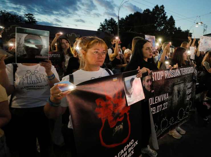 Parenti e amici dei difensori delle acciaierie Azovstal di Mariupol, in Ucraina, partecipano, il 29 luglio, a una cerimonia per ricordare le vittime dell’esplosione del campo di Olenivka un anno fa. Foto Ansa/Epa Sergey Dolzhenko