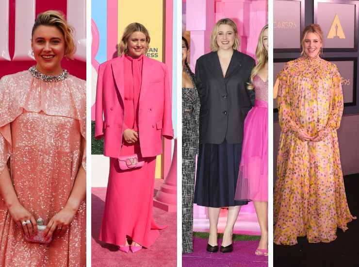 A Los Angeles, invece, ha proposto una creazione di Valentino che deve tutto il suo glam alla sfumatura Pink PP. La regista ha proposto un long dress rosa, a cui ha abbinato un blazer poggiato sulle spalle e pochette della maison italiana. In aggiunta ha scelto gioielli di Cartier. A Seoul per la première di Barbie, invece, ha indossato un completo total black con gonna plissé e blazer monopetto. Sul red carpet dei Governors Awards 2022, è apparsa con un abito floreale dalle sfumature pastello che cade morbido senza fasciare troppo le curve della maternità. L’abito a maniche lunghe con rouches è firmato Carolina Herrera.