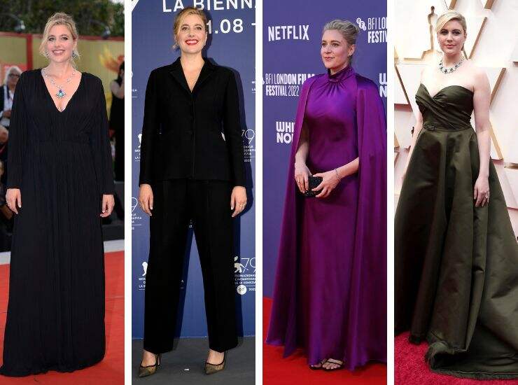 In qualità di attrice, ha partecipato anche alla Mostra del Cinema di Venezia nel 2022 per la première di Rumore Bianco. Sul tappeto rosso italiano, Greta Gerwig ha scelto un long dress nero a trama plissé, una creazione costum di Gucci a cui ha abbinato un collier di Bulgari Alta Gioielleria. Poco prima, al photocall in Laguna, l’attrice ha proposto un tailleur total black, semplice ma efficace, di Christian Dior. Per la première dello stesso film, ma al London Film Festival, ha proposto un abito mantella sfumatura Very Peri in raso. Anche sul tappeto rosso degli Oscar 2020, ha sfoggiato un abito in raso verde bottiglia.