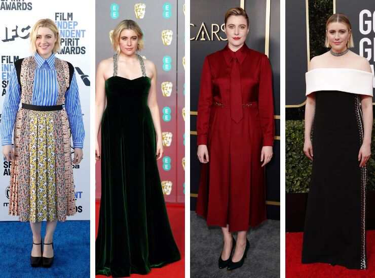 Ai Film Independent Spirit Awards 2020, Greta Gerwig ha calcato il red carpet con un midi colorato e giocoso che punta a varie fantasie, dalle righe al floreale con un tocco di pois ed è firmato Prada. Sul tappeto rosso dei BAFTA 2020, invece, ha riproposto un look verde smeraldo, in velluto, un long dress con bretelle gioiello firmato Gucci. Per gli Oscar Nominees Luncheon, sempre nel 2020, ha sfoggiato un abito in raso rosso cremisi in raso, con cravatta in pendant, sempre Gucci. Infine, ai Golden Globes 2020, ha scelto un abito black&white aderente di Proenza Schouler.