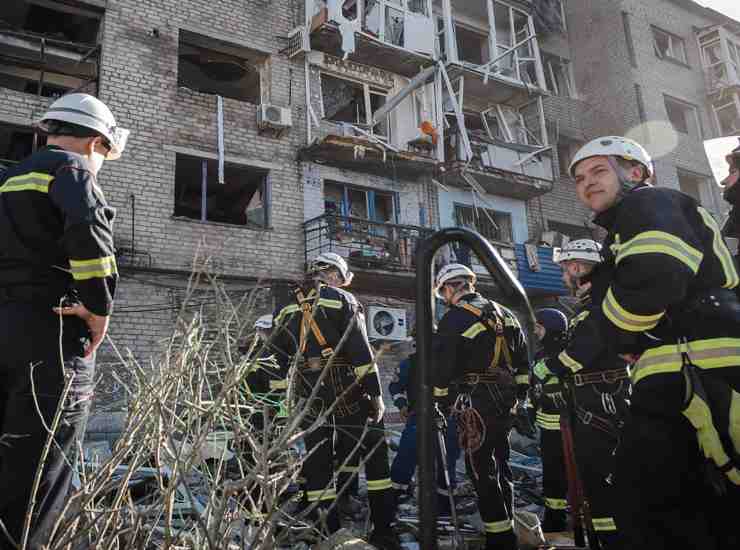 Soccorritori ucraini a Pokrovsk, bombardata dai russi. Foto Ansa/Epa/Ses, Servizio emergenza ucraina