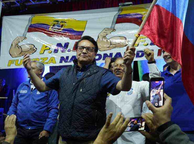 Fernando Villavicencio al suo comizio pochi minuti prima di essere colpito a morte, a Quito. Foto Ansa/Epa