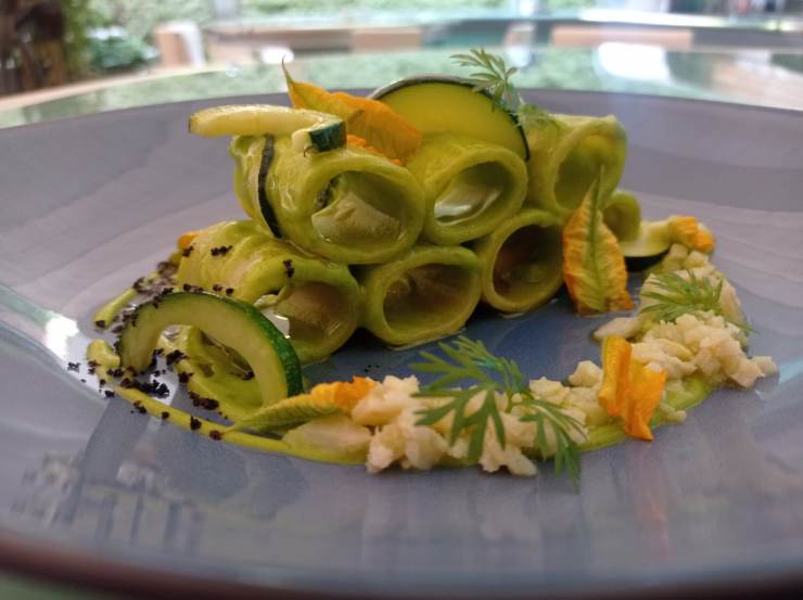 Per quanto riguarda la seconda delle ricette proposte per l’estate 2023 si tratta dei paccheri di Gragnano alla crema di zucchine romane e polpa di granchio direttamente dal Salone Eva Hotel Hassler con l’Executive Chef Marcello Romano.
