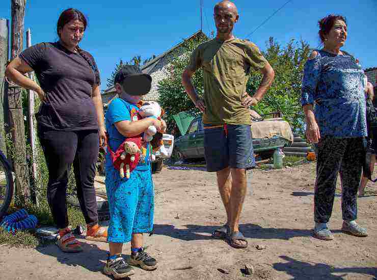 Vadym Bunescu, 4 anni, in piedi accanto a sua madre (a sinstra) e ai vicini mentre aspetta l’evacuazione obbligatoria dei civili a Kruglyakovka vicino a Kupyansk, nell’area di Kharkiv, il 15 agosto 2023. Foto Ansa/Epa Sergey Kozlov