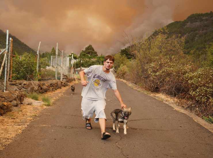 Un uomo si allontana con i suoi cani dalle fiamme a Candelaria, sull’isola di Tenerife. Foto Ansa/Epa Ramon de La Rocha