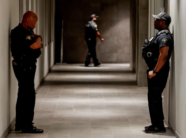 Poliziotti davanti agli uffici del procuratore della Georgia, Fani Willis, che ha incriminato Trump. Foto Ansa/Epa Erik S. Minore