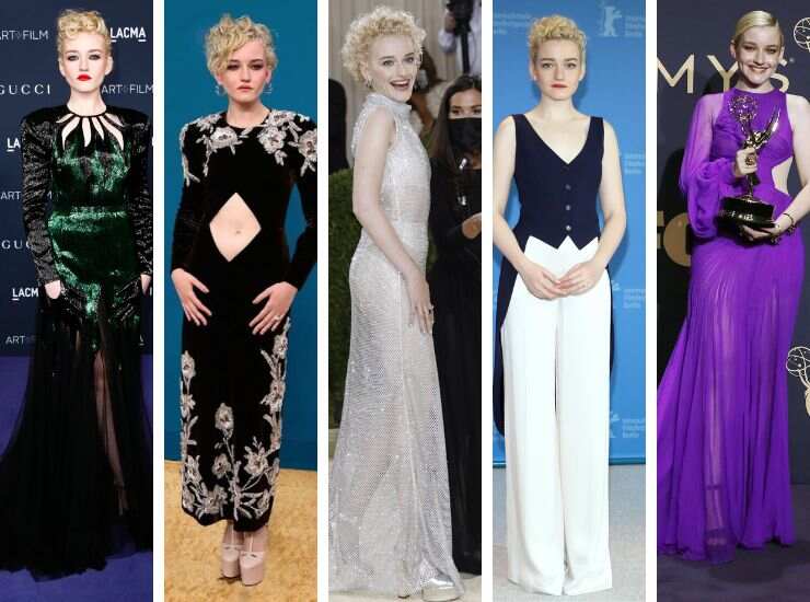 Ai LACMA Art + Film Gala 2022, Julia Garner non poteva che esaltare la bellezza di Gucci con un abito in velluto ravvivato da paillettes verde smeraldo. Della stessa maison è l’abito nero in velluto con dettaglio cut out ad altezza ombelico scelto per gli Emmy Awards 2022. Sul tappeto rosso del Met Gala 2021, invece, ha indossato un abito d’argento che gioca con le trasparenze firmato Stella McCartney. Vi ha abbinato gioielli di Harry Winston e sandali con plateau di Giuseppe Zanotti. Sul tappeto rosso della Berlinale Film Festival nel 2020, ha indossato un completo con gilet blu di Ralph Lauren Collection. Infine, agli Emmy Awards 2019, ha optato per un cut out dress con dettagli plissé di Cong Tri.
