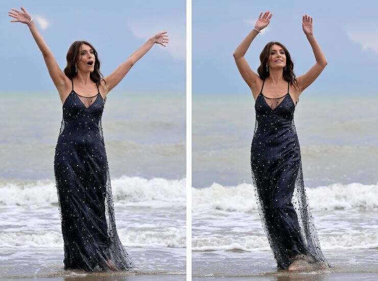 Quest’anno, infatti, il Lido dovrà fare a meno di alcune stelle di Hollywood. Non tutte (come il cast di Priscilla ad esempio), ma la maggior parte ha aderito allo sciopero degli attori ancora in corso ad Hollywood, lo stesso menzionato da Caterina Murino. Quindi non sfilerà neppure sul tappeto rosso di Venezia. Intanto, per il suo bagno tradizionale, la Madrina ha indossato un abito blu notte. Si tratta di uno slip dress rivestito da una trama in chiffon accompagnata da paillettes luminose. L’abito aderisce perfettamente al corpo quando l’attrice entra in acqua, giocando con le onde, e porta la firma di Giorgio Armani.