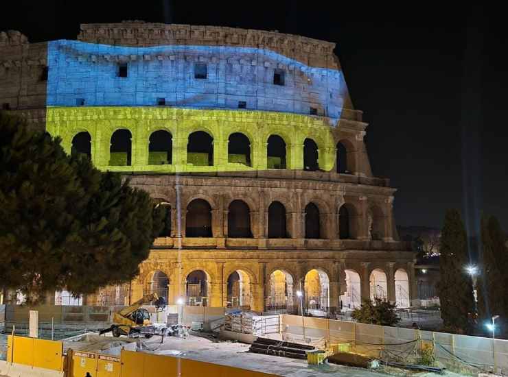 In occasione della Giornata dell’Indipendenza ucraina, il 24 agosto, il Colosseo è stato illuminato con i colori della bandiera di Kiev. Foto Ansa