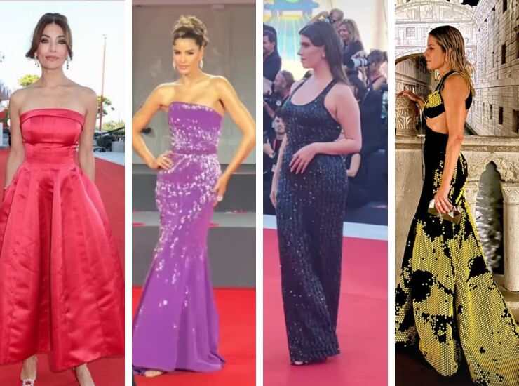 Caterina Murino questa volta sceglie un look rosa shocking. Per il suo ottavo red carpet a Venezia 2023, la Madrina ha preferito un midi in raso, senza spalline e gonna a ruota di Philosophy di Lorenzo Serafini. Vi ha abbinato décolleté ton sur ton e orecchini pendenti in oro. Elisabetta Pellini spezza il trend del total black, tanto piaciuto alle star di questa edizione, e aggiunge un tocco giallo neon al suo abito cut out. Giovanna Sannino invece rispetta la tendenza, con un abito aderente rivestito di paillettes nere di Michael Kors Collection. Ariadna Gutierrez invece riappare sul red carpet, questa volta in un abito lilla senza spalline con aggiunta di paillettes.