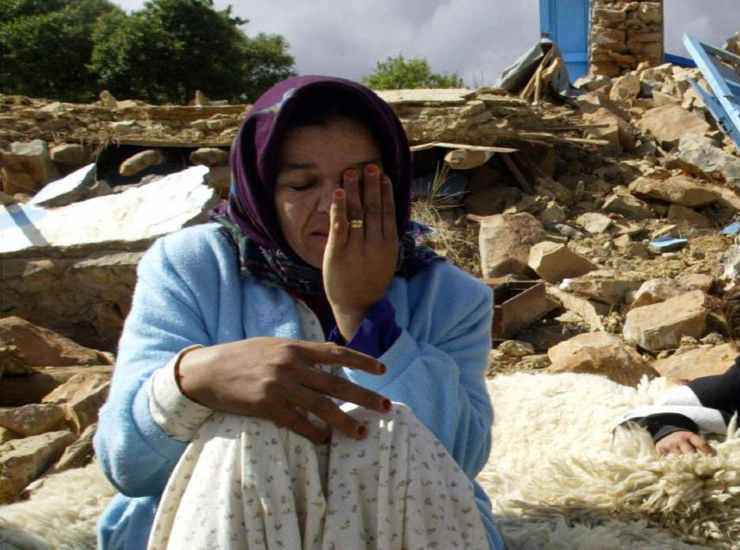 La disperazione di una donna sulle macerie della sua casa in Marocco. Foto Twitter @AngiKappa
