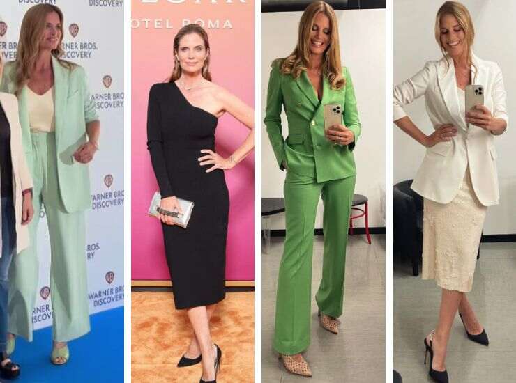 E ancora per il programma di Fabio Fazio ha proposto un completo jumpsuit rosso ciliegia con fiocco ad altezza fianco firmato Max Mara, a cui ha abbinato mules nude di Michael Kors. Con un debole per i tailleur, la conduttrice è apparsa anche alla precedente Milano Fashion Week di febbraio, proponendo un completo champagne con giacca ton sur ton di Brunello Cucinelli. Total black è invece il completo gonna in chiffon e blusa a collo alto per Che Tempo Che Fa, firmato Peserico. Per H&M, invece, ha indossato un completo total white accompagnato da blazer oversize rosa confetto tempestata di glitter.