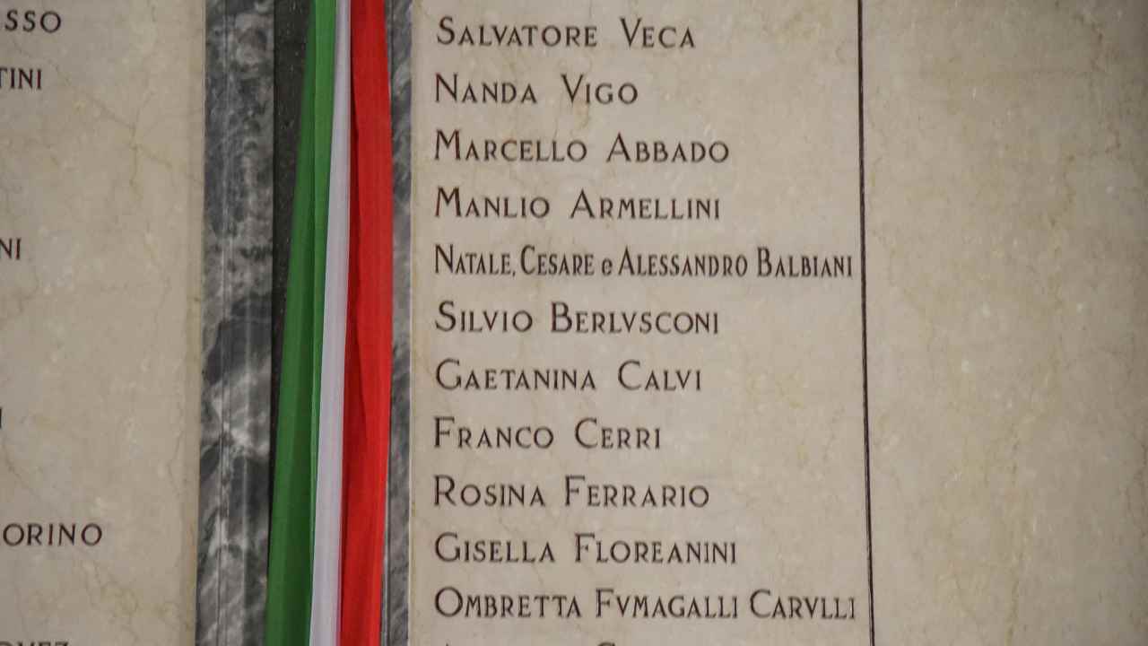 Il nome di Berlusconi inserito nel Famedio dei milanesi illustri. Foto Ansa/Matteo Corner