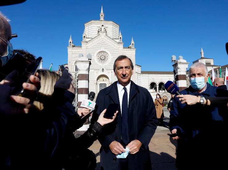 Il sindaco di Milano, Beppe Sala, davanti al Famedio del Cimitero Monumentale. Foto Ansa/Mourad Balti Touati