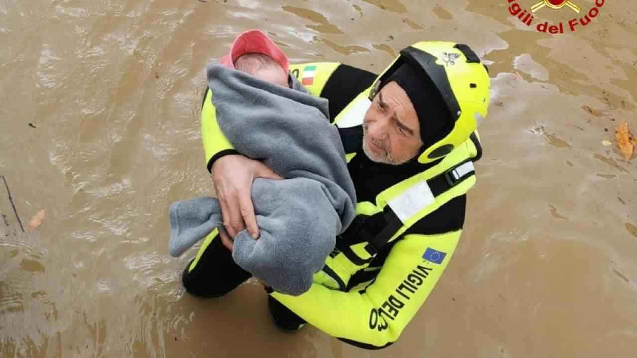 Un vigile del fuoco porta in salvo un neonato a Quarrata (Pistoia). Foto Twitter @EugenioGiani