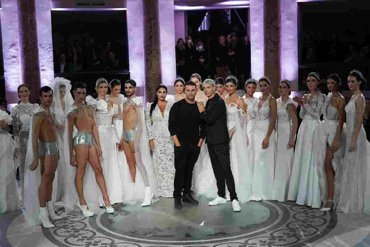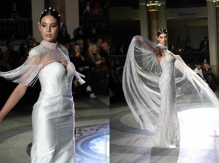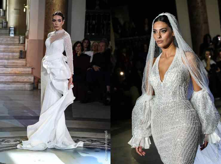 L’abito più desiderato rimane la linea sirena e quella ampia, le mie spose gradiscono ciò che inventai nel 1994: l’abito da sposa trasformabile. Allora ricordo che era di gran moda l’abito da viaggio per il taglio della torta, io volevo invece qualcosa di magico, volevo trasformare le mie donne. Lentamente e timidamente le mamme accettarono che le figlie decidessero ciò che volevano, quindi l’effetto wow prese piede. Nel 1995 compresi che tutto questo poteva essere una mia grande forza e portai in passerella le trasformazioni. Sapete chi fu la mia prima modella alla quale trasformai l’abito? La bella Lara Orfei! Tutti gli atelier iniziavano a guardarmi, dopo il velo più lungo del mondo e gli show in passerella, iniziavo ad esistere per il grande pubblico.