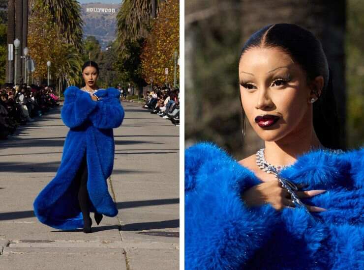 Con capelli raccolti in una lunghissima coda XXL rigorosamente liscia e con riga centrale, Cardi B è apparsa per Balenciaga avvolta in un maxi cappotto di pelliccia in un’audace sfumatura di blu, rigorosamente elettrico, catturando tutta l’attenzione su di sé mentre alle spalle campeggia in alto la scritta Hollywood, riferimento del cinema. Organizzata alla Windsor Boulevard di Los Angeles, la sfilata ha scelto come passerella una lingua d’asfalto particolarmente rinomata ad Hollywood. E Cardi B non ha perso quest’occasione così ghiotta, partecipando alla sfilata questa volta non come ospite, ma tra le protagoniste. Fasciata nel suo morbidissimo long coat blu elettrico, ha abbinato un make-up dalle sfumature marcate, con smokey eye intenso, eyeliner e labbra prugna.