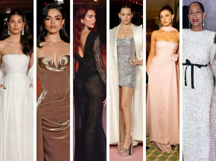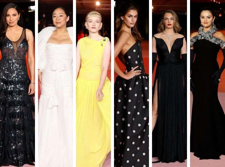 Total black è l’abito di Jurnee Smollett, accompagnato con gonna a balze e maxi paillettes effetto Mermaid firmato Louis Vuitton. Stesso colore scelto anche da Cara Delevingne, che sul red carpet sfoggia una creazione dal corpetto scenografico e gonna in tulle di Del Core. Vi ha abbinato guanti in velluto ton sur ton. Anche Selena Gomez ha preferito total black velvet, con una scollatura impreziosita da rouches d’argento di Valentino. Invece Stephanie Hsu ha scelto un abito bianco completamente drappeggiato, con gonna in tulle e maniche a sbuffo di Giambattista Valli. Vi ha abbinato eleganti gioielli di KatKim.
