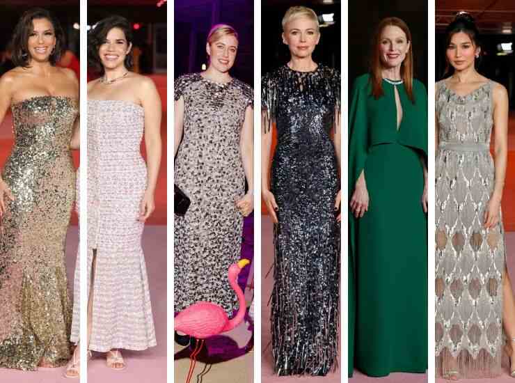 America Ferrera, dopo il successo di Barbie, riappare sul red carpet fasciata in un abito senza spalline con fantasia colorata di Chanel. Al suo fianco anche Eva Longoria, con un long dress tempestato di paillettes in oro di Dolce&Gabbana. La regista Greta Gerwig ha partecipato ai Academy Museum Gala 2023 con un midi a maniche corte completamente rivestito da una delicata trama floreale di Chanel. Blu notte, ma rivestito di paillettes e frange è invece l’abito di Michelle Williams firmato Louis Vuitton. Julianne Moore sceglie un colore che l’è particolarmente vicino, un verde smeraldo, a cui ha abbinato gioielli di Tiffany&Co. Gemma Chan, invece, ha optato per un abito d’argento a trama geometrica di Louis Vuitton.