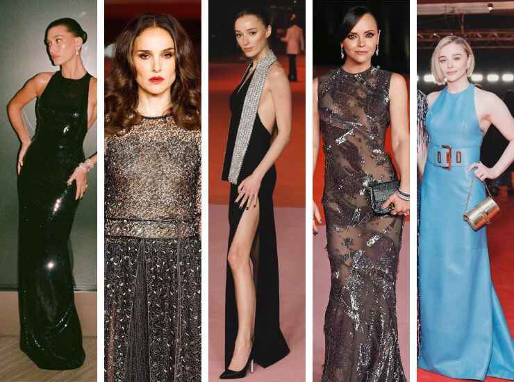 Total black è anche l’abito proposto da Phoebe Dynevor, accompagnato da un foulard di paillettes argentate di Louis Vuitton. Così come l’abito aderente di Hailey Bieber firmato Saint Laurent. Christina Ricci ha preferito giocare con un look nude accompagnato da paillettes grigio fumo di Fendi. Vi ha abbinato gioielli di Martin Katz. Natalie Portman rincorre sfumature di oro e nero con il suo look firmato Dior. Infine Chloe Grace Moretz ha scelto un abito turchese con maxi cintura ton sur ton di Louis Vuitton.