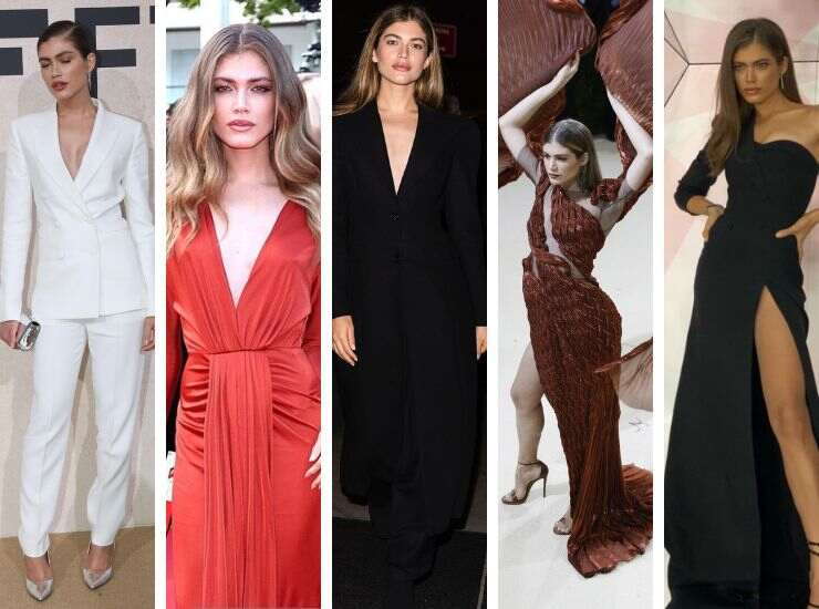 Per la première di Asteroid City, invece, sempre in quel di Cannes Valentina Sampaio ha sfoggiato un look total black. Il suo abito con scollo a barchetta è accompagnato da una cascata di paillettes e scollatura in stile vedo-non-vedo lato fondoschiena a forma di cuore. Il suo look porta la firma di Pinko. I gioielli invece sono di Fred Jewelry. Sul red carpet di Harper’s Bazaar per l’evento Women of the Year 2022, la modella ha sfoggiato un cut out dress total black a collo alto di Michael Kors. Ha abbinato una pochette di Emporio Armani e sandali di Stuart Weitzman. Il 2022 è stato anche l’anno della Mostra del Cinema di Venezia. Per l’occasione, la modella ha indossato un abito nude rivestito di delicati ricami floreali. Per la première di Bones and All, ha scelto una creazione di Giorgio Armani.