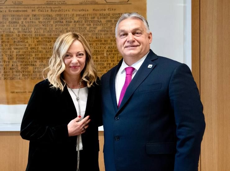Giorgia Meloni con Viktor Orban al Consiglio europeo. Foto Ansa/Chigi