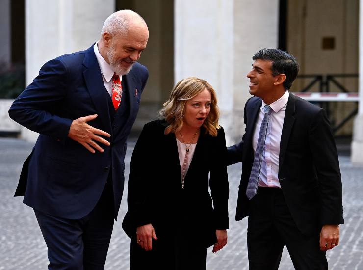 Giorgia Meloni con il premier albanese, Edi Rama (a sinistra), e quello britannico, Rishi Sunak (a destra) il 16 dicembre. Foto Ansa/Riccardo Antimiani