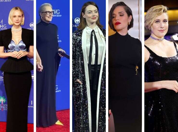 Meryl Streep ha scelto la semplicità, fasciata in un abito nero a collo alto che calza leggermente morbido sulle curve. Il tocco di stile è dato dalle décolleté a punta in oro, che aggiungono colore al look. Anche Emma Stone riappare sul tappeto rosso fasciata in un look costum di Louis Vuitton black&white. America Ferrera invece ha optato per un abito aderente nero a collo alto e maxi spacco ad altezza coscia di Lela Rose. Stessa palette adottata da Greta Gerwig, nel suo abito dalla gonna vaporosa e rivestito di paillettes.