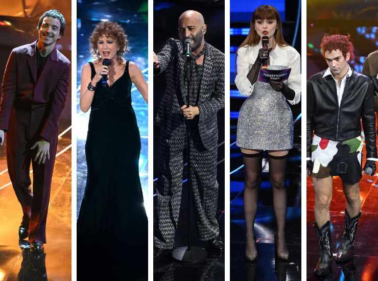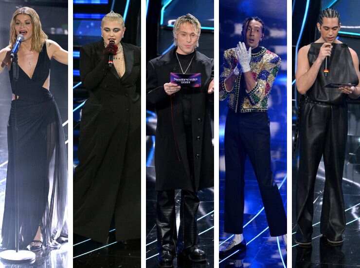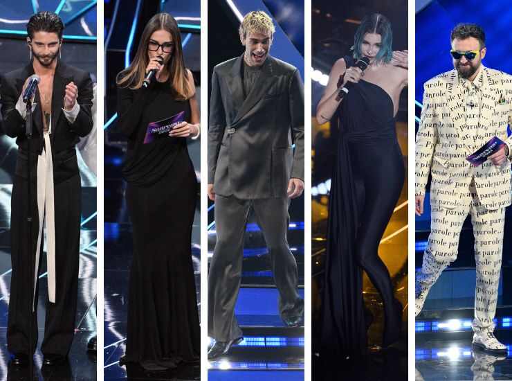 Mr Rain invece riappare sul palcoscenico dell’Ariston cambiando ancora una volta palette e declina il suo nero in un grigio fumo, opaco, fasciato in un completo con giacca monopetto di Fendi. Rigorosamente nero è anche il completo jumpsuit scelto da Rose Villain, con dettaglio monospalla e maxi scollatura lato schiena di Balenciaga. Dargen D’Amico prosegue con i suoi completi Moschino, questa volta bianco panna e con un pattern che richiama continuamente “parole”, anche sulle calzature. Sensuale e ancora total black è il cut out dress scelto da Alessandra Amoroso, con corpetto ad intreccio e maxi spacco della gonna firmato Roberto Cavalli.