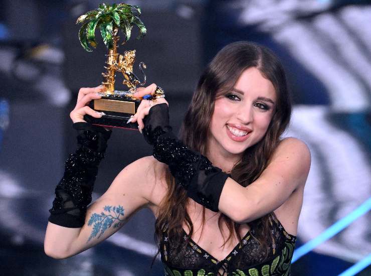 Angelina Mango with the trophy after winning the Sanremo Italian Song Festival at the Ariston theatre during the 74th Sanremo Italian Song Festival, Sanremo, Italy, 10