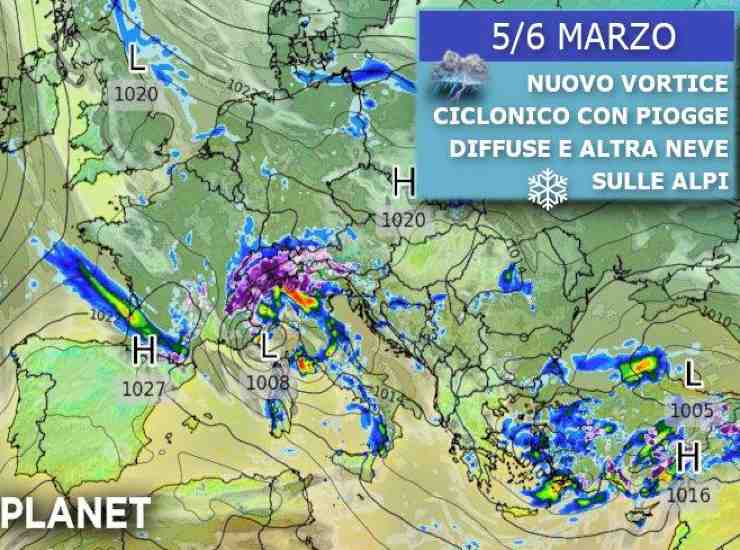 Il meteorologo osserva che “non sarà un colpo di coda dell’inverno. È un tempo normale per questo periodo, ma arriva dopo un febbraio in cui le temperature sono state sopra la media e che, in pratica, si è comportato come il mese di marzo“. Martedì 5 marzo è infatti attesa una nuova perturbazione, che si farà sentire al Nord e che fra mercoledì 6 e giovedì 7 allontanandosi dall’Italia, porterà al Centro e al Sud un po’ di maltempo diffuso.