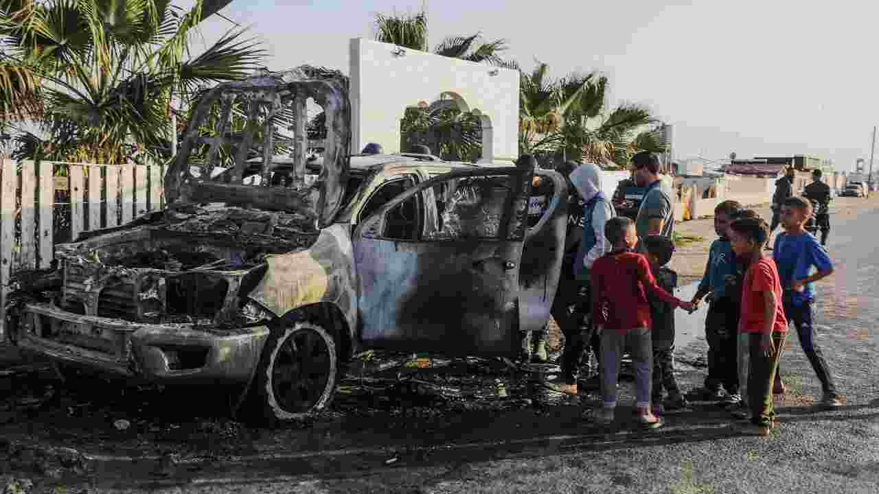 Bambini e adulti presso l’auto distrutta della World Central Kitchen. Foto Ansa/Epa Mohammed Saber