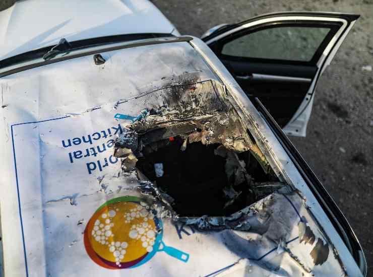 L’auto distrutta della World Central Kitchen (WCK). Foto Ansa/Epa Mohammed Saber