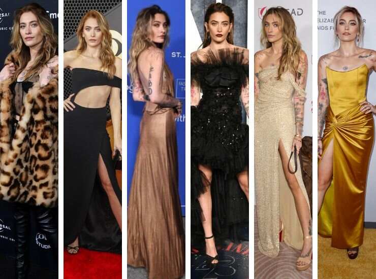 In occasione dei Fashion Trust 2023, invece, Paris Jackson ha optato per un look caramello, un long dress in raso con scollatura lato schiena che fa parte dell’archivio Gucci. Vi ha aggiunto décolleté di Stuart Weitzman. Sul red carpet dei Vanity Fair Oscar Party 2023 ha sfoggiato un look total black con gonna dal taglio asimmetrico di rouches, accompagnata da uno strascico ton sur ton. A ravvivare il tutto una cascata di paillettes e strass lucidi. L’abito è di Giambattista Valli Haute Couture. Vi ha abbinato dei sandali con plateau neri di Louboutin. Sfumatura champagne è l’abito con delicati drappeggi che ha scelto per The Elizabeth Taylor Ball. Sfumatura senape, ma effetto velluto, è il midi che ha proposto allo stesso evento, ma nel 2022.