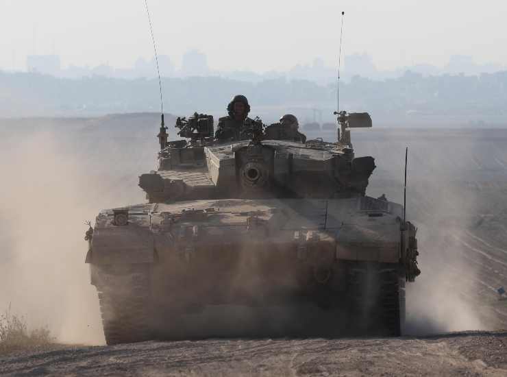 Un carro armato dell’esercito israeliano lungo il confine con Gaza. Foto Ansa/Epa Abir Sultan