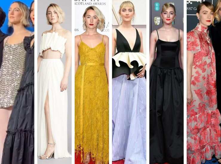 Saoirse Ronan è apparsa recentemente sul tappeto rosso, in occasione del Berlin Film Festival 2024 dove ha presentato in anteprima The Outrun. Per l’occasione ha indossato naturalmente un look di Louis Vuitton. Il suo è un long dress composto, con un minidress di paillettes oro effetto specchio e una gonna in chiffon bianco che accompagna le gambe. Anche i sandali aggiunti portano la firma della maison francese. Sul red carpet degli Academy Museum Gala 2023, l’attrice ha rafforzato il sodalizio con Louis Vuitton indossando un completo due pezzi dal crop top increspato total white. Nel 2022, invece, ha partecipato ai BAFTA Scotland Awards scegliendo un abito drappeggiato giallo mostarda con cintura ton sur ton di Erdem, della collezione Primavera/Estate 2023. Vi ha abbinato dei sandali in oro di Rene Caovilla.