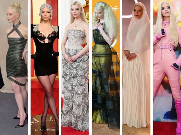 Una delle recentissime apparizioni di Anya Taylor-Joy sul tappeto rosso riguarda il CinemaCon 2024 dove ha presentato Furiosa: A Mad Max Fury Road. Per l’occasione l’attrice ha sfoggiato un minidress degno del suo personaggio, total black e interamente rivestito di borchie con spalline intrecciate firmato Ludovic de Saint Sernin. Poche settimane fa, invece, ha partecipato alla premiazione degli Oscar 2024, scegliendo per il red carpet una creazione d’argento con gonna ravvivata da delicati petali tempestati di paillettes e cristalli di Dior Haute Couture. Poco dopo, per gli after party di Vanity Fair, ha optato per un cambio look. In questo caso ha scelto un minidress in velluto nero con corpetto destrutturato in chiffon a forma di farfalla e spalline rigide, ravvivate da decorazioni d’argento effetto gioiello.