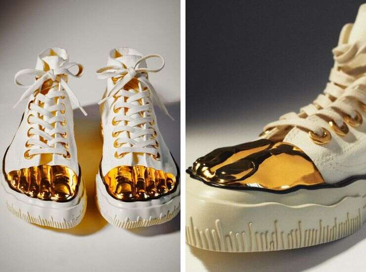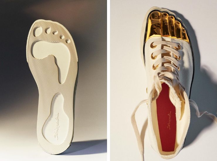 Un secolo dopo è stato Daniel Roseberry a rivisitare quel patrimonio sportivo proponendo la prima sneaker di Schiaparelli. Si presenta in tela ecrù, chiara, leggermente alta dove spicca soprattutto l’effetto dorato delle dita trompe l’oeil. In oro anche gli occhielli della calzatura. Ultimo tocco chic è anche il calco dell’impronta sulla suola che richiama la pianta del piede e che il direttore creativo ha mostrato anche via Instagram. Pur essendo diventata virale adesso, la Schiaparelli Gold Toe Trainers è apparsa per la prima volta in passerella alla Fashion Week di Parigi del 2023. Di fatto è parte della collezione Primavera/Estate 2024.