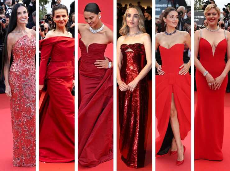 Uno dei colori più utilizzati a Cannes è il total red, in tutte le sue sfumature. Oltre ad Heidi Klum, anche Demi Moore ha scelto un abito colonna senza spalline rosso corallo rivestito di pietre preziose in rilievo e cristalli firmato Giorgio Armani Privé. Vi ha abbinato dei preziosi Chopard che richiamassero la luminosità del look. Per Juliette Binoche il rosso è sfumatura vino, un abito con strascico e scollo a barchetta firmato Dior Haute Couture.