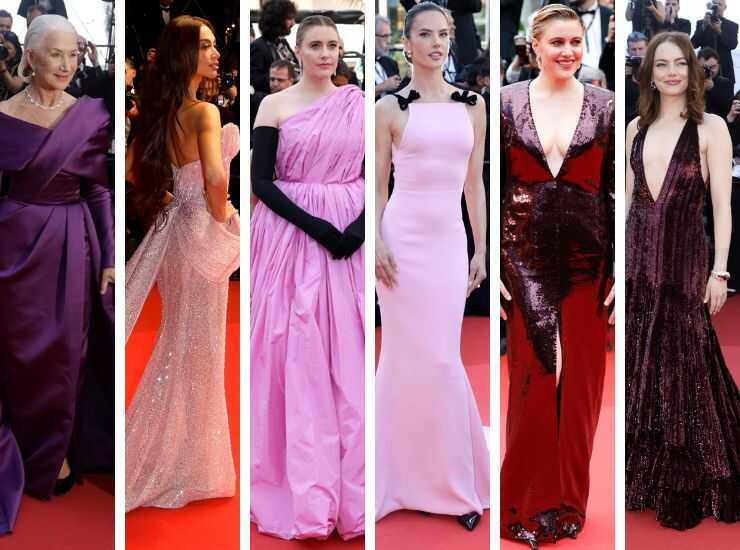Si rincorrono anche sfumature di rosa sul red carpet di Cannes, dal rosa pastello di Alessandra Ambrosio firmato Prada, in raso e con fiocchi neri in velluto ad altezza spalline, fino al rosa Barbie di Greta Gerwig firmato Balenciaga. Kylie Verzosa ha scelto una romantica sfumatura rosa perla con l’aggiunta di paillettes firmato Mark Bumgarner. Di una sfumatura bordeaux è invece il long dress con profonda scollatura a V e maniche lunghe di Greta Gerwig firmato Saint Laurent. Colore simile, con tantissime paillettes è il look di Emma Stone firmato Louis Vuitton. Helen Mirren, invece, rilancia il viola in raso, lucidissimo, di Elie Saab.