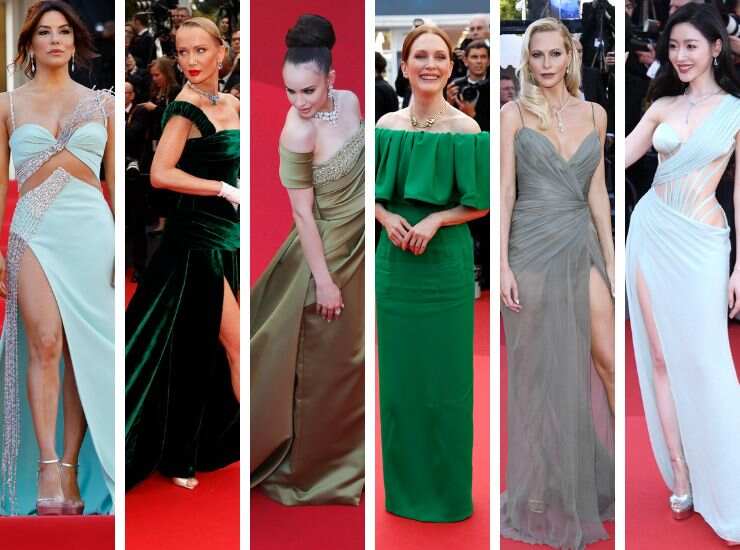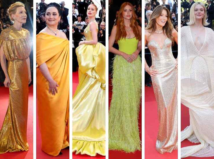 E concludiamo con una sfilza di look che esaltano le sfumature total yellow, oro incluse, come quella di Cate Blanchett: un abito total golden tempestato di paillettes firmato Louis Vuitton. E ancora il giallo oro e rigorosamente in raso scelto da Lily Gladstone e firmato Balenciaga. Marina Ruy Barbosa ha giocato con diverse sfumature di giallo: il primo, oro lucido, punta ad una gonna vaporosa dallo strascico XXL ed è firmato da Miss Sohee. Il secondo tende al neon, con gonna di piume firmato Gucci. In oro invece è l’abito senza spalline proposto da Carla Bruni e firmato Celine. Infine, pur non essendo interamente in palette, il look di Elle Fanning ravvivato da margherite coloratissime di Gucci.