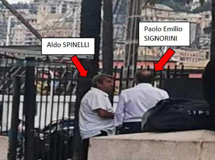 Aldo Spinelli e Paolo Emilio Signorini parlano a Genova il 29 luglio 2022. Foto agli atti dell’inchiesta. Ansa