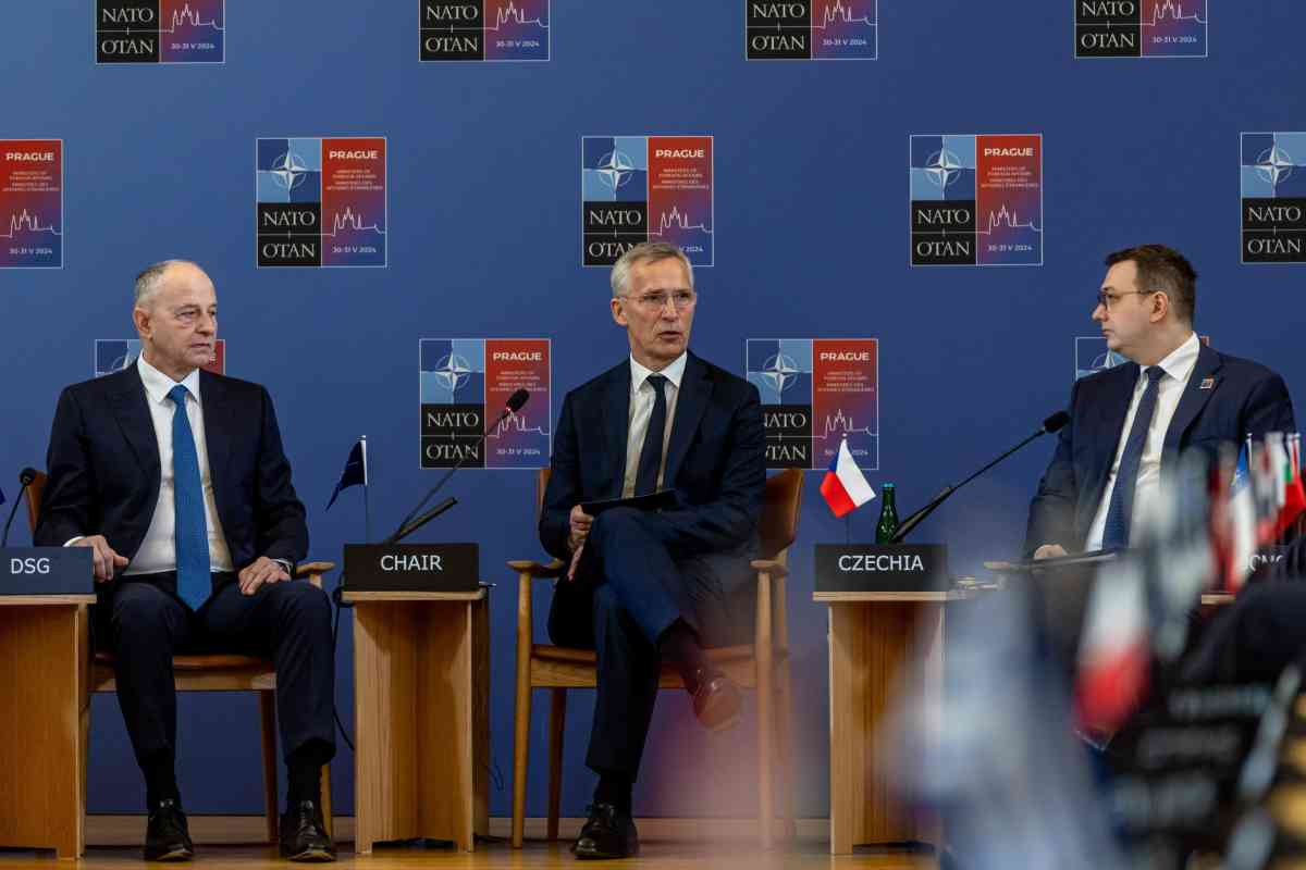 NATO Secretary General Jens Stoltenberg (C) starts the informal NATO Foreign Ministers Meeting at Czernin Palace, in Prague, Czech Republic, 31 May 2024. One of the main topic of the two-day informal meeting of NATO foreign ministers is the search for consensus on the Alliance’s next steps in support of Ukraine and discuss priorities for the upcoming NATO Washington Summit. EPA/MARTIN DIVISEK / POOL