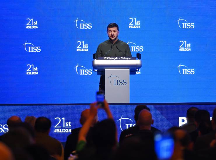 Ukraine President Volodymyr Zelensky delivers his speech during the International Institute for Strategic Studies (IISS) 21th Shangri-La Dialogue in Singapore, 02 June 2024. Defense ministers and officials from 45 countries are gathered in the city state for the IISS Shangri-la Dialogue, an annual high level defence summit in the Asia Pacific region. EPA/SHINTARO TAY/THE STRAITS TIMES SINGAPORE OUT