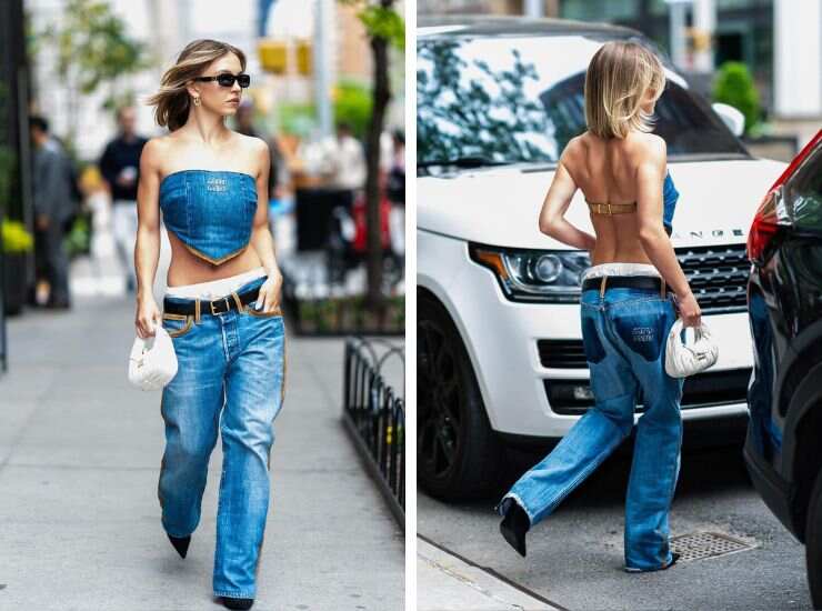 A rendere il suo look a prova di diva sono le décolleté total white con la punta a V effetto metallico. E richiama la pochette mezzaluna tra le mani. Sempre total denim ma dal retrogusto vintage è invece il look firmato Miu Miu. Per Sydney Sweeney indossare i capi della maison italiana ha sempre un valore aggiunto, essendo molto legata alla sua realtà. In questo caso ha indossato un colore più vibrante, con jeans rigorosamente a vita bassa e ravvivato da una maxi cintura nera che richiamano le décolleté a punta. La vera chicca è il top senza spalline, senza scollatura e che si chiude a punta, sfiorando l’ombelico, lasciando la schiena completamente scoperta, eccetto il gancio effetto cuoio. Un look che l’attrice ha sfoggiato prima di raggiungere il red carpet del Met Gala 2024 e che ricalca il trend Y2K.