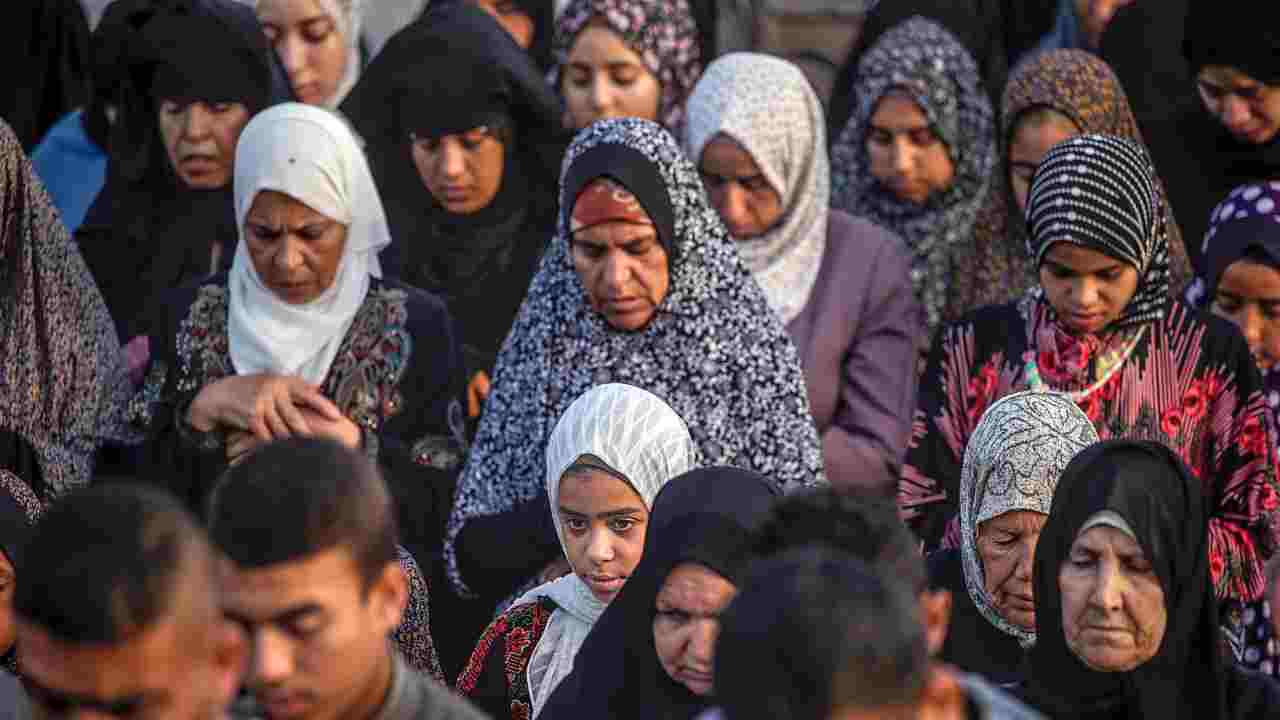 Palestinesi alla preghiera di Eid al-Adha nella città di Khan Younis, nel sud della Striscia di Gaza, il 16 giugno 2024. Foto Ansa/Mohammed Saber