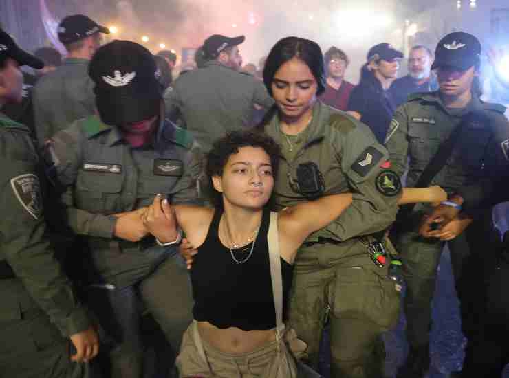 Una manifestante israeliana contro la guerra arrestata a Tel Aviv. Foto Ansa/Epa Abir Sultan